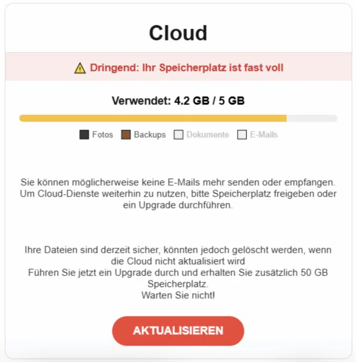 Frage: „Seit ein paar Tagen erhalte ich E-Mails von einem ,Cloud Kundenservice‘ mit der E-Mail-Adresse applemusic@QuickBuy5sf.onmicrosoft.com. Im Betreff steht, dass mein Cloud-Speicher bald auslaufen soll und meine Daten gelöscht werden. Ich verwende Cloud-Speicher von Google. In meinem Google-Konto finde ich keinen Hinweis auf ein Auslaufen des Cloud-Speichers. Es sind außerdem noch über 100 GB Speicherplatz